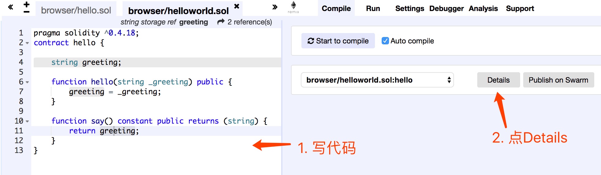 把这段代码写(拷贝)到Browser-Solidity,如果没有错误,点击Details获取部署代码,如: