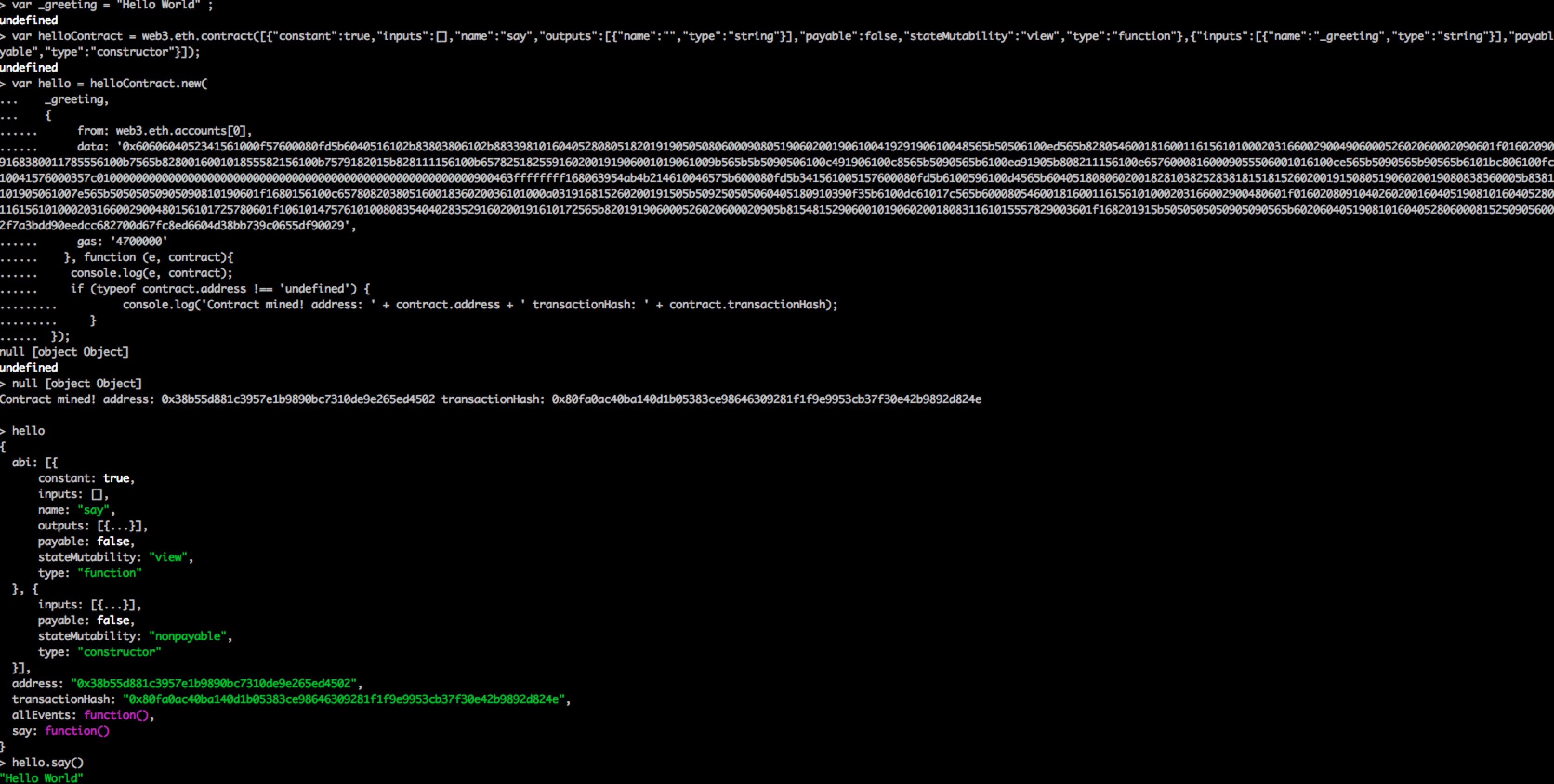 输出Hello World,我们第一个合约Hello World,成功运行了。